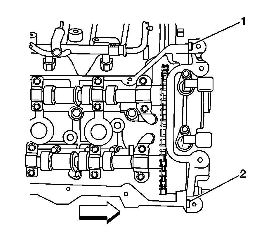 2. Place a small amount of sealant at the split line (1, 2) of the right cylinder head and the right camshaft position actuator housing. Refer to Adhesives, Fluids, Lubricants, and Sealers (Adhesives, Fluids, Lubricants, and Sealers).