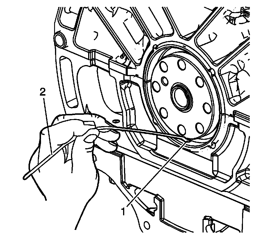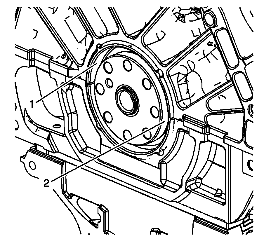 2. Inspect the engine block bore (1) and the crankshaft flange (2) for the damage. Repair or replace any damaged components.