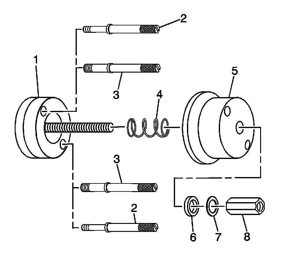 5. Remove the proper sized bolts from the J 45930-A - installer. Use the bolts (2) 8 mm or the bolts (3) 11 mm.