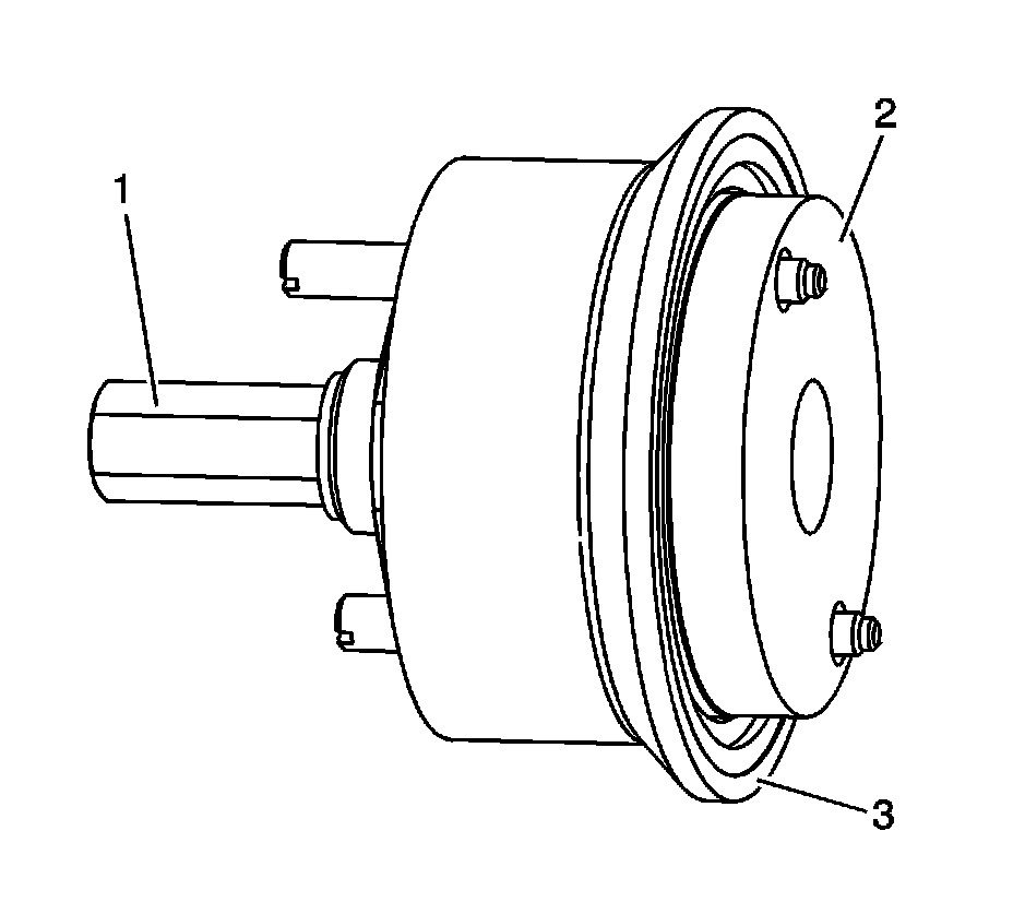 17. Turn the center nut (1) of the J 45930-A - installer until the center hub (2) protrudes approximately 15 mm (0.591 in) beyond the outer plate (3).