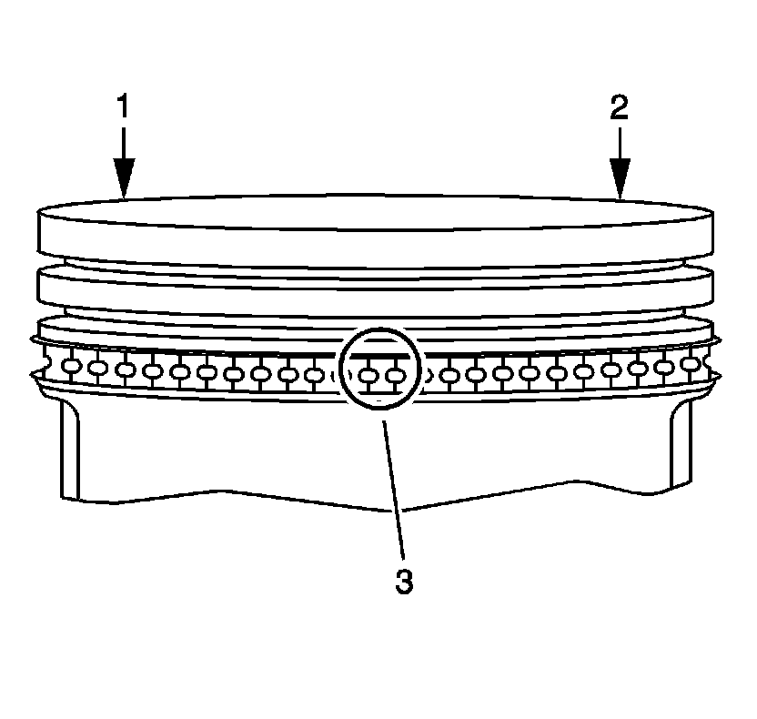 1. Properly orient the piston (1) on the connecting rod (2) as follows: