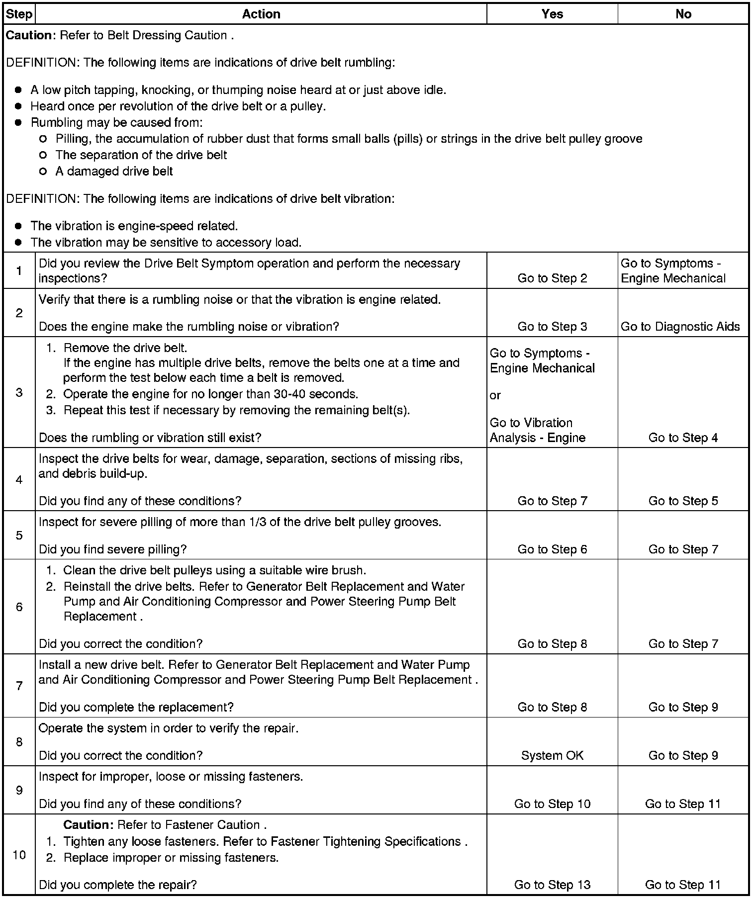 3. This test is to verify that one of the drive belts is causing the rumbling noise or vibration. Rumbling noise may be confused with an internal engine noise due to the similarity in the description. Remove only one drive belt at a time if the vehicle has multiple drive belts. When removing the drive belts the water pump may not be operating and the engine may overheat. Also DTCs may set when the engine is operating with the drive belts removed.
