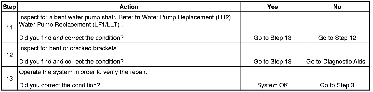11. This step should only be performed if the water pump is driven by the drive belt. Inspect the water pump shaft for being bent. Also inspect the water pump bearings for smooth operation and excessive play. Compare the water pump with a known good water pump.
