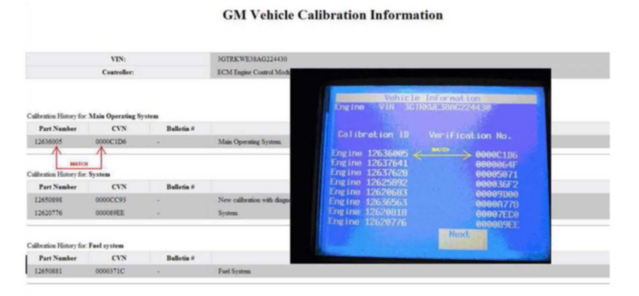Compare each: Calibration ID Part Number and Verification No. (Number/CVN) from your Tech 2 photo to the corresponding Calibration ID Part Number and Verification No. (Number/CVN) listed in the TIS2WEB GM Vehicle Calibration Information screen of TIS2WEB to ensure that they are ALL an EXACT MATCH.