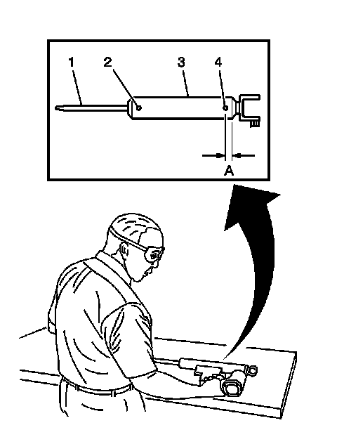 4. Drill a hole in the shock absorber at the centerpunch (4) using a 5 mm (3/16 in) drill bit. Gas or a gas/oil mixture will exhaust when the drill bit penetrates the shock absorber. Use shop towels in order to contain the escaping oil.