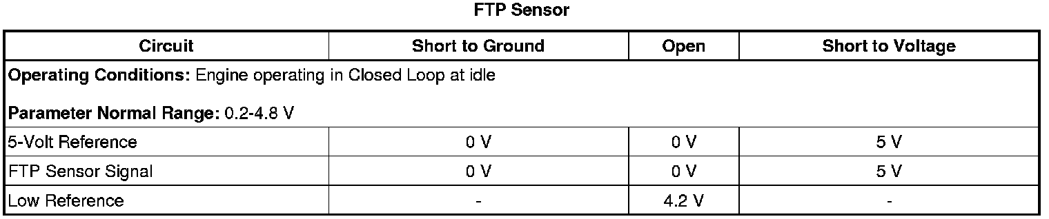 The ECM detects the FTP sensor signal voltage is greater than 4.85 volts for 4 seconds, or a cumulative of 30 seconds.