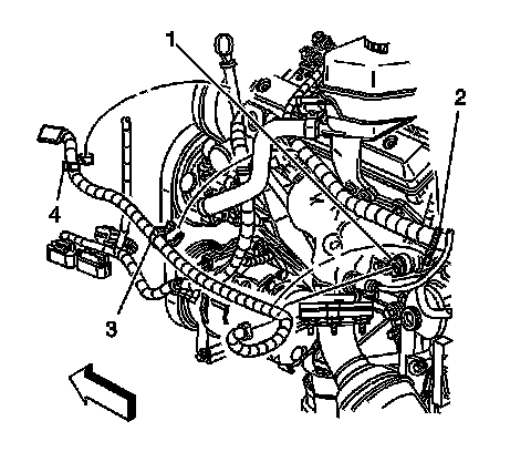 7. Secure the coolant heater cord clips (3, 4) to the following: