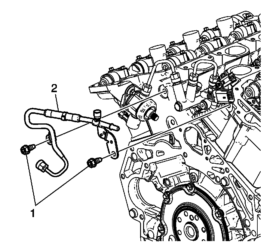 12. Install the fuel feed pipe bolts (1) and tighten to 10 Nm (89 lb in).