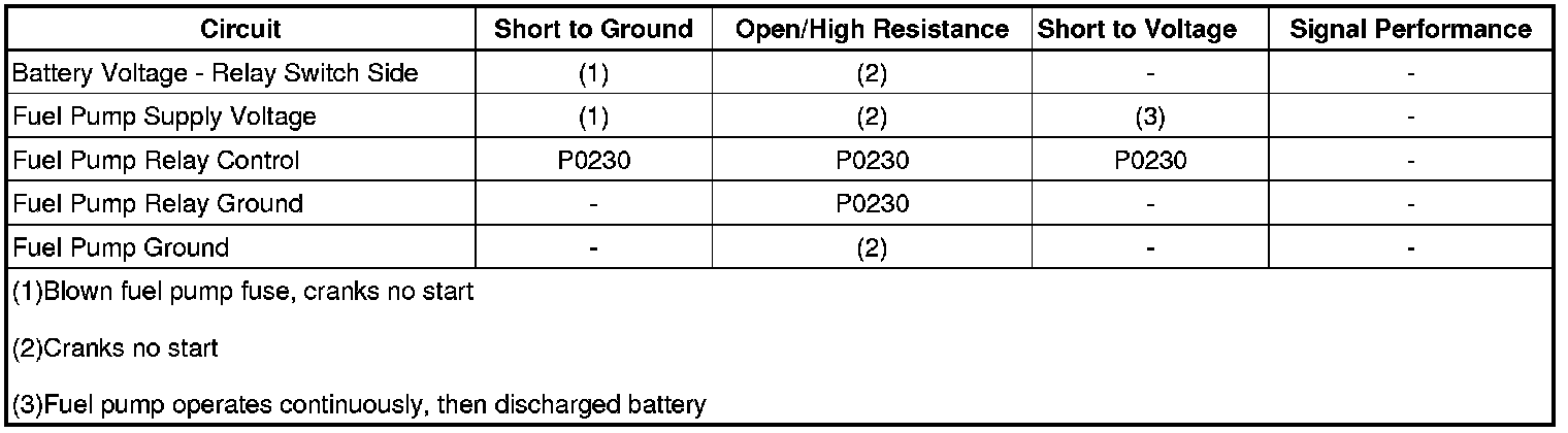 The control module monitors the voltage on the fuel pump relay control circuit. If the control module detects an incorrect voltage on the fuel pump relay control circuit, a fuel pump relay control DTC sets.