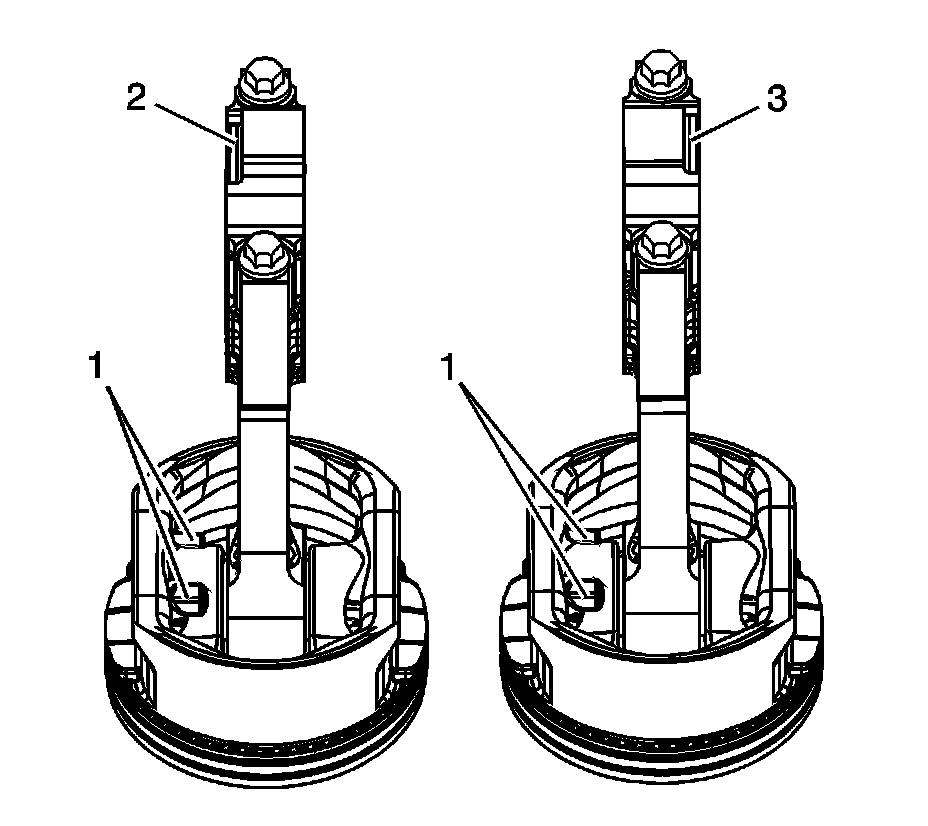 * The notch (3) on the right piston assembly connecting rod cap is oriented towards the rear of the engine. The piston locator lugs (1) and the connecting rod cap notch (3) in the opposing orientation.