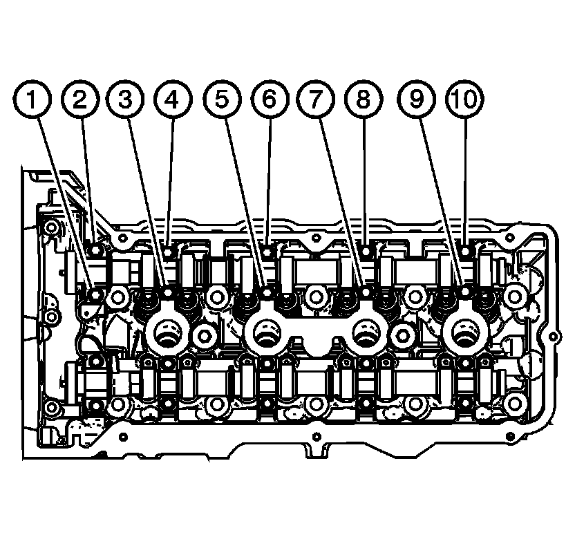 Note: Ensure each valve rocker arm is properly aligned to the valve tip, the valve lifter and the camshaft lobe. Inspect the alignment prior to and after the camshaft caps are tightened to specifications.