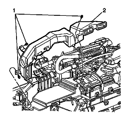 5. Remove the left air duct (2), by unsnapping the air duct from the HVAC module.