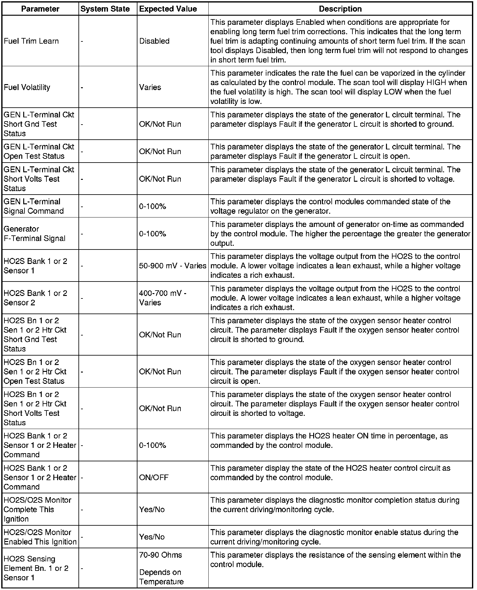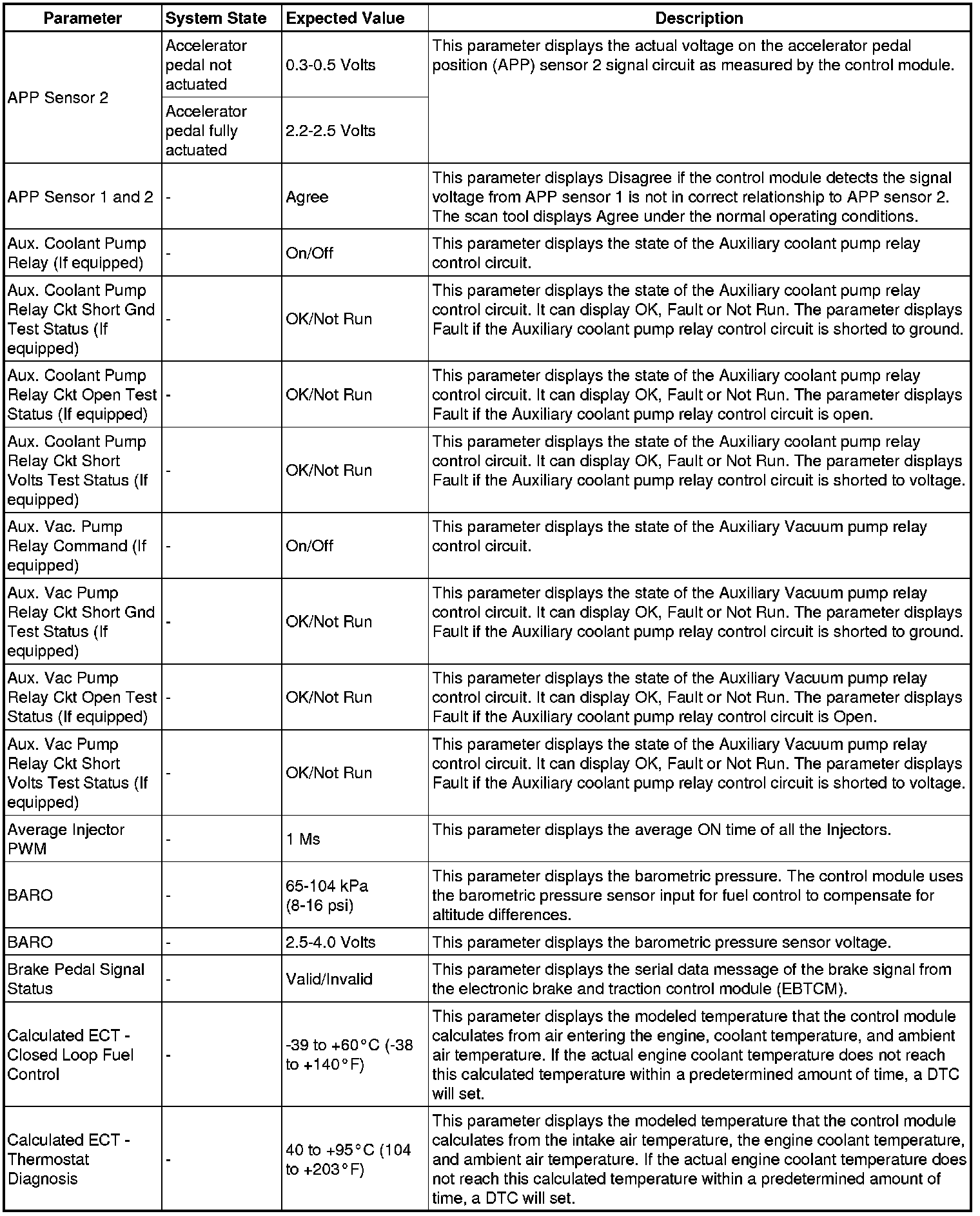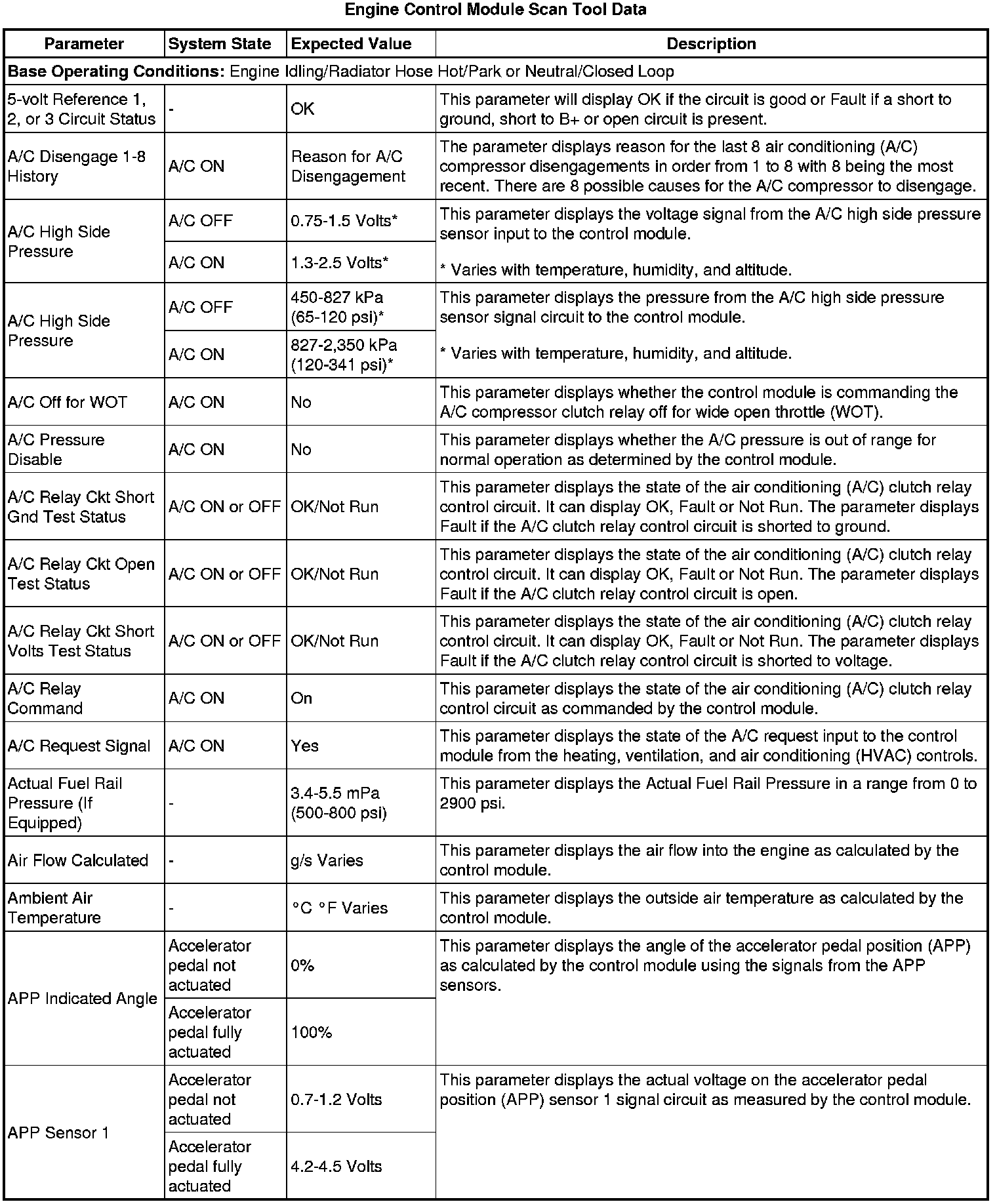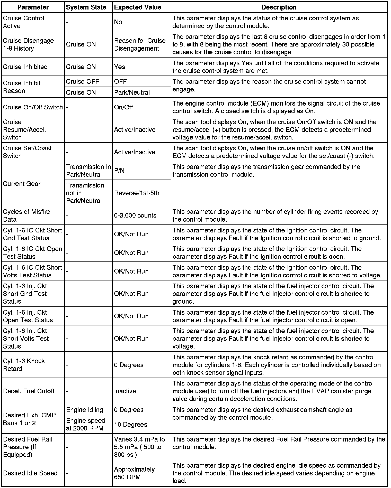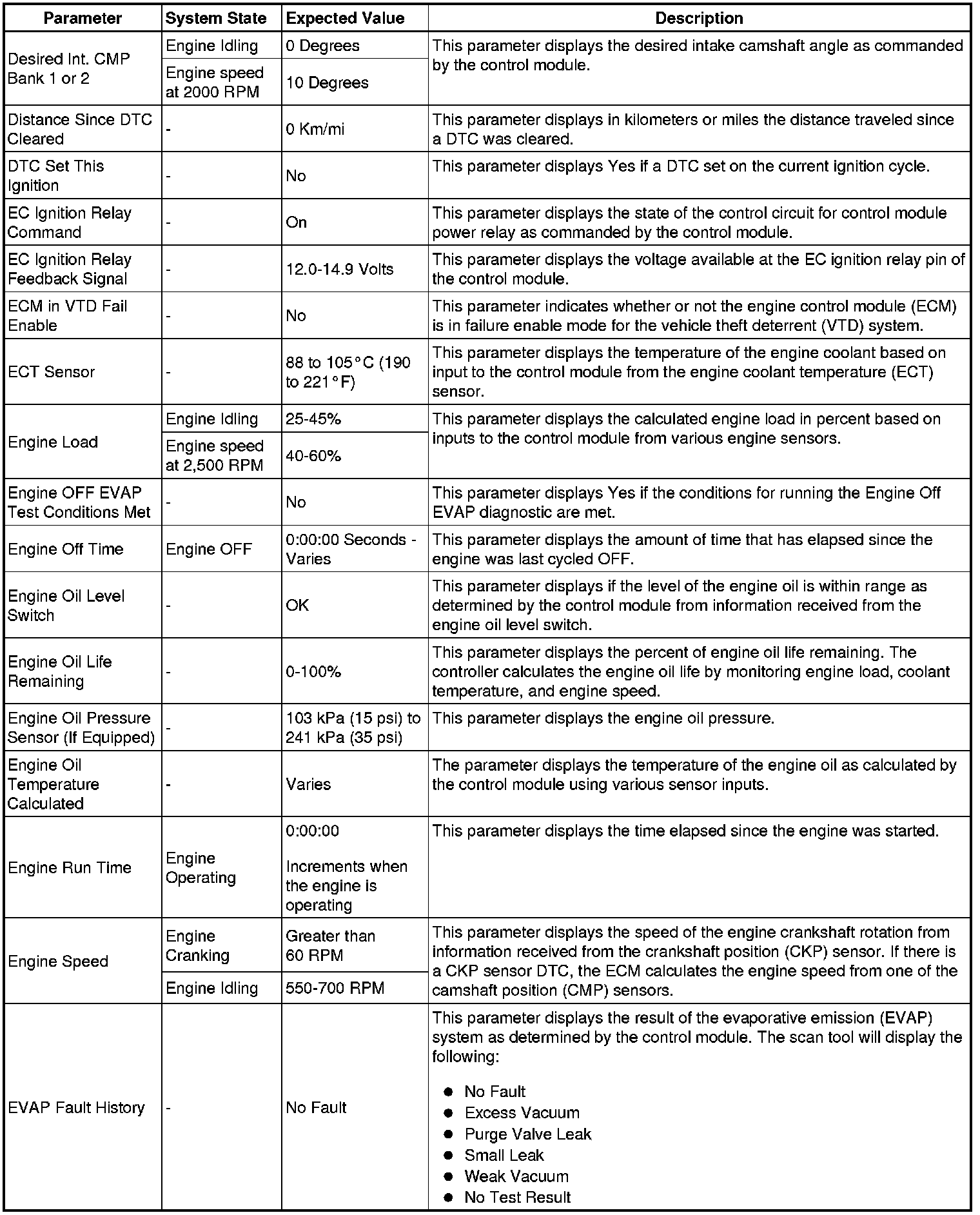 The Engine Control Module Scan Tool Data List contains all engine-related parameters that are available on the scan tool. The list is arranged in alphabetical order. A given parameter may appear in any one of the data lists, and in some cases may appear more than once, or in more than one data list in order to group certain related parameters together.