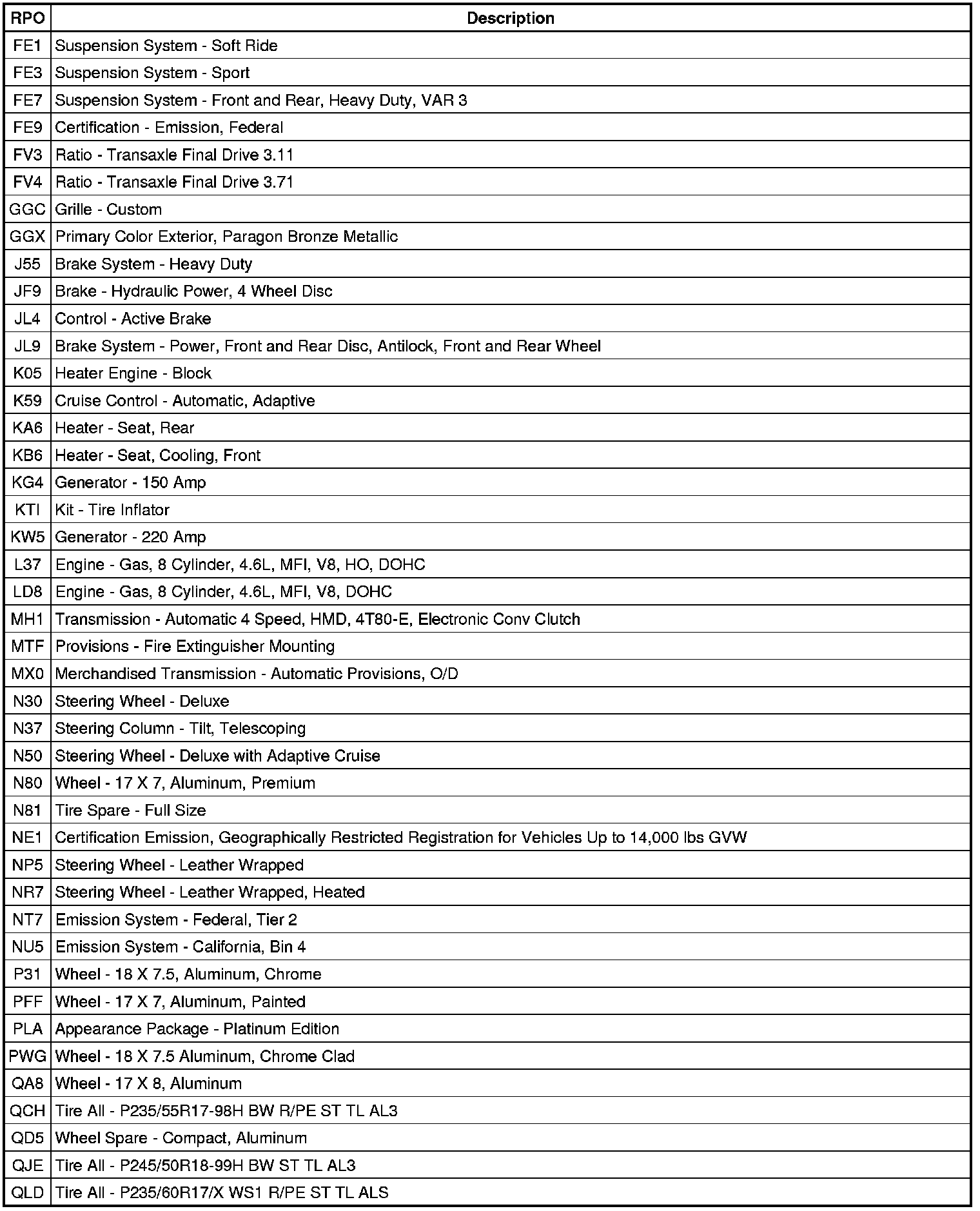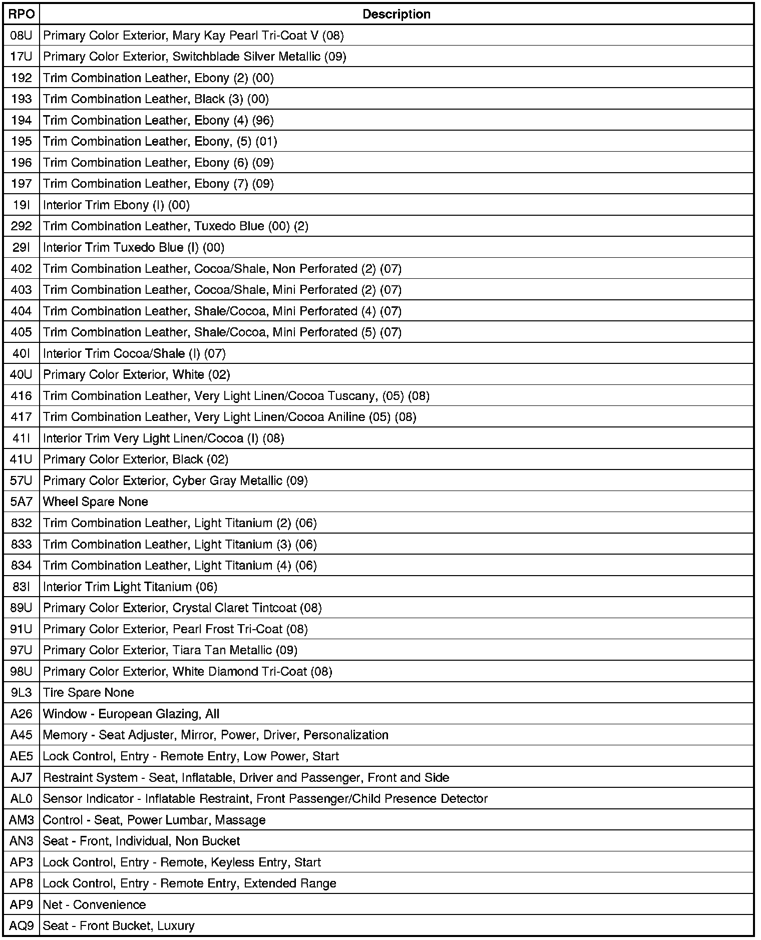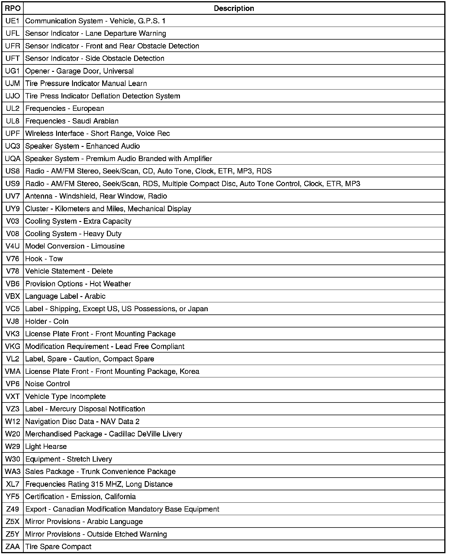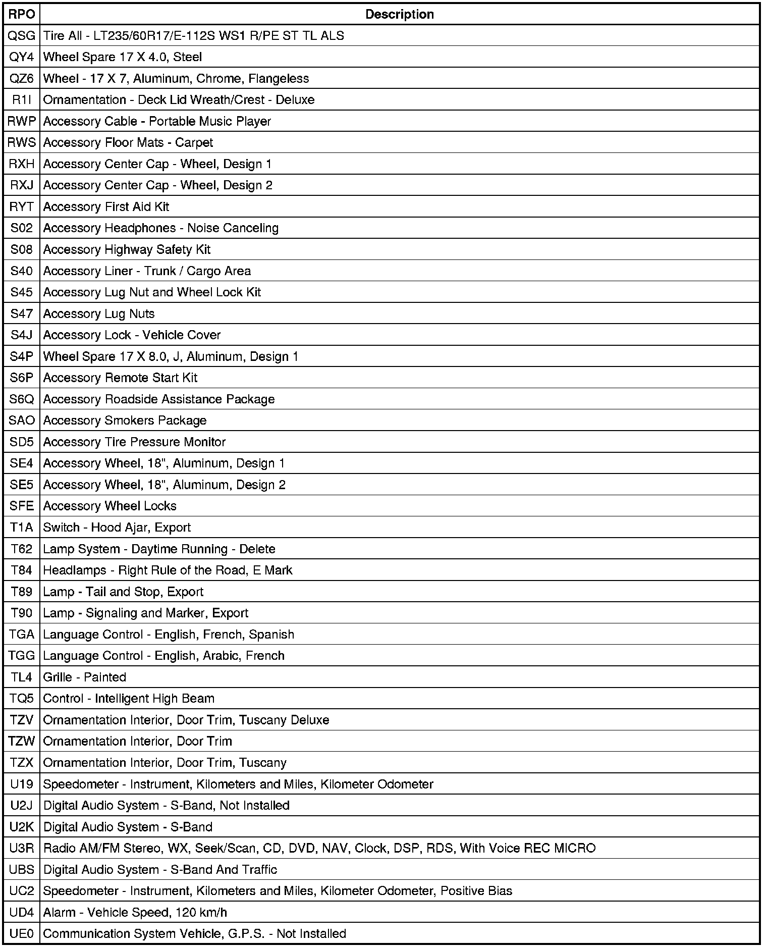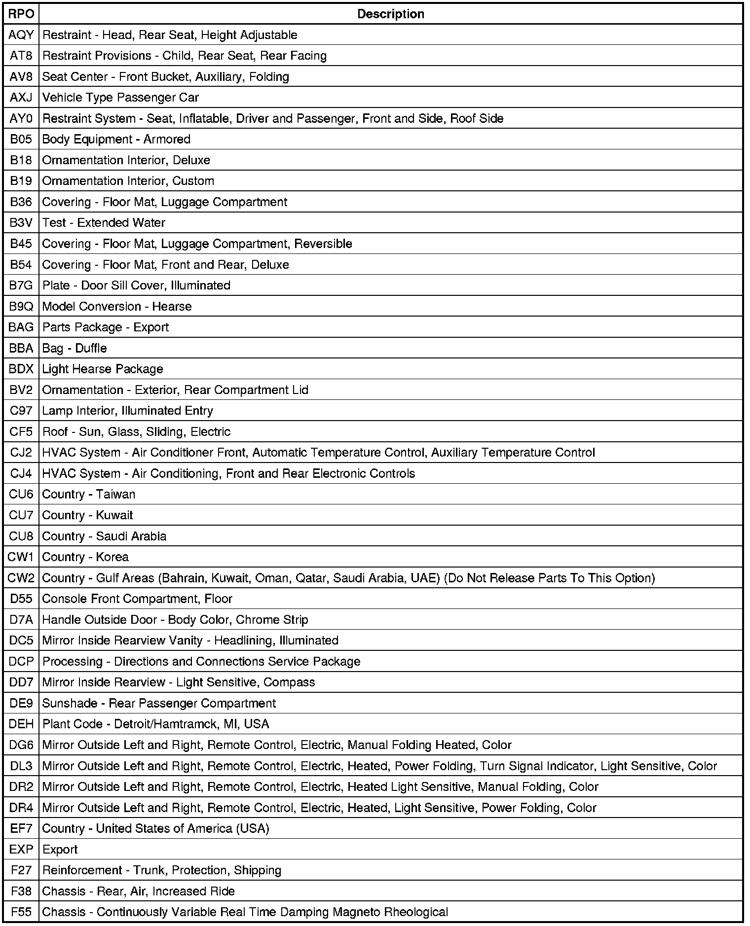 RPO Code List