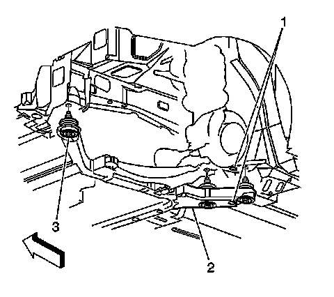 19.Remove the engine frame insulator bolts (3) retaining the engine frame (2) to the vehicle.
