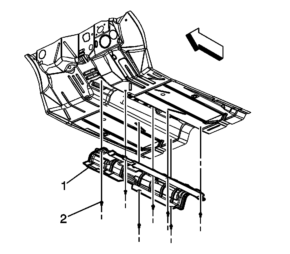 2. Using a rivet gun, install the rivets (2), except for this location (1), this rivet will be installed with the oxygen sensor heat shield.