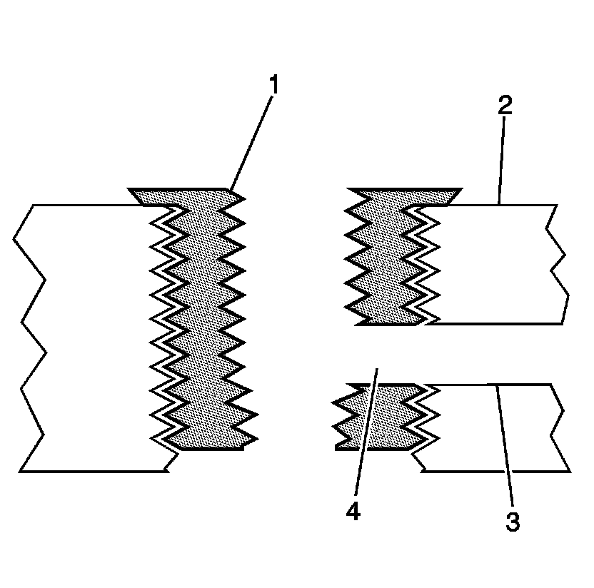 11. Apply threadlock sealant, EN 42385-109, LOCTITE 277(R) or equivalent (1) to the insert OD threads (2). Refer to Adhesives, Fluids, Lubricants, and Sealers (Adhesives, Fluids, Lubricants, and Sealers) for recommended sealant.
