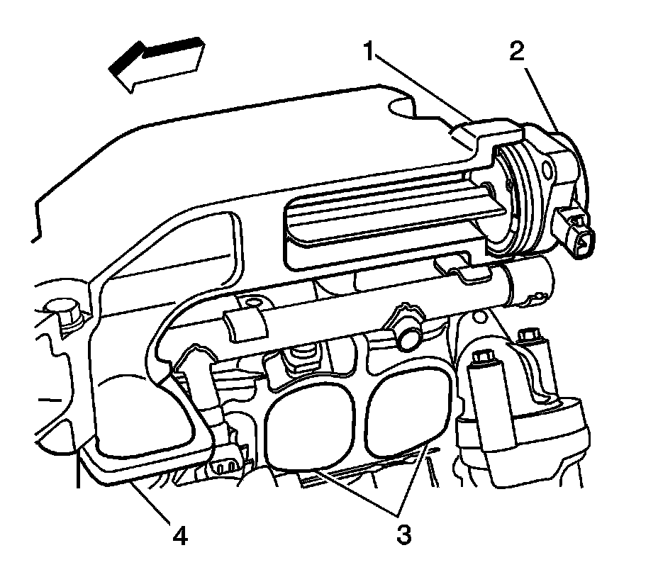 An intake manifold tuning (IMT) Valve (2) is used to change the intake manifold runner configuration. When the IMT valve is open, the intake manifold is configured to one large plenum (4). When the IMT valve is closed, the intake manifold is configured to two smaller plenums (3). The two intake manifold runner sizes result in different torque curves which improves performance at low and high engine speeds. The IMT valve is located in the intake manifold (1). The IMT valve solenoid is supplied with ignition 1 voltage and is controlled by the engine control module (ECM).