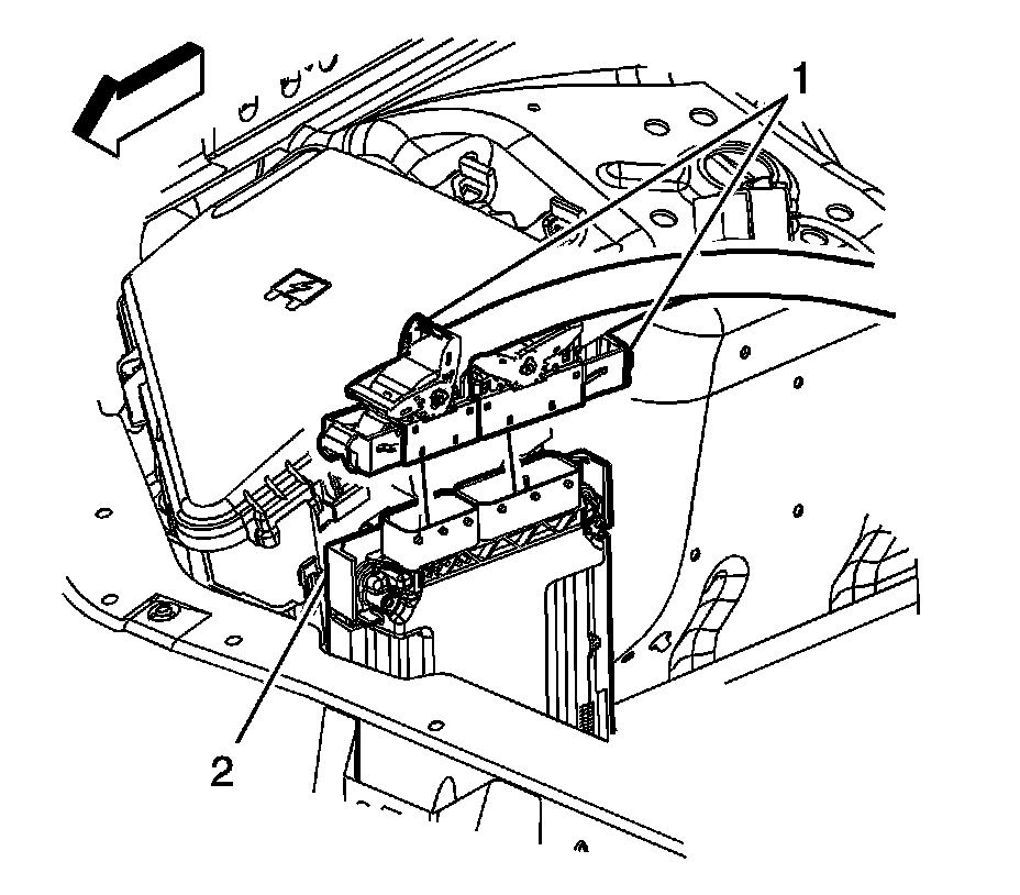 4. Slide the ECM (1) into the ECM bracket, ensure that the ECM engages the bracket retainers (2).