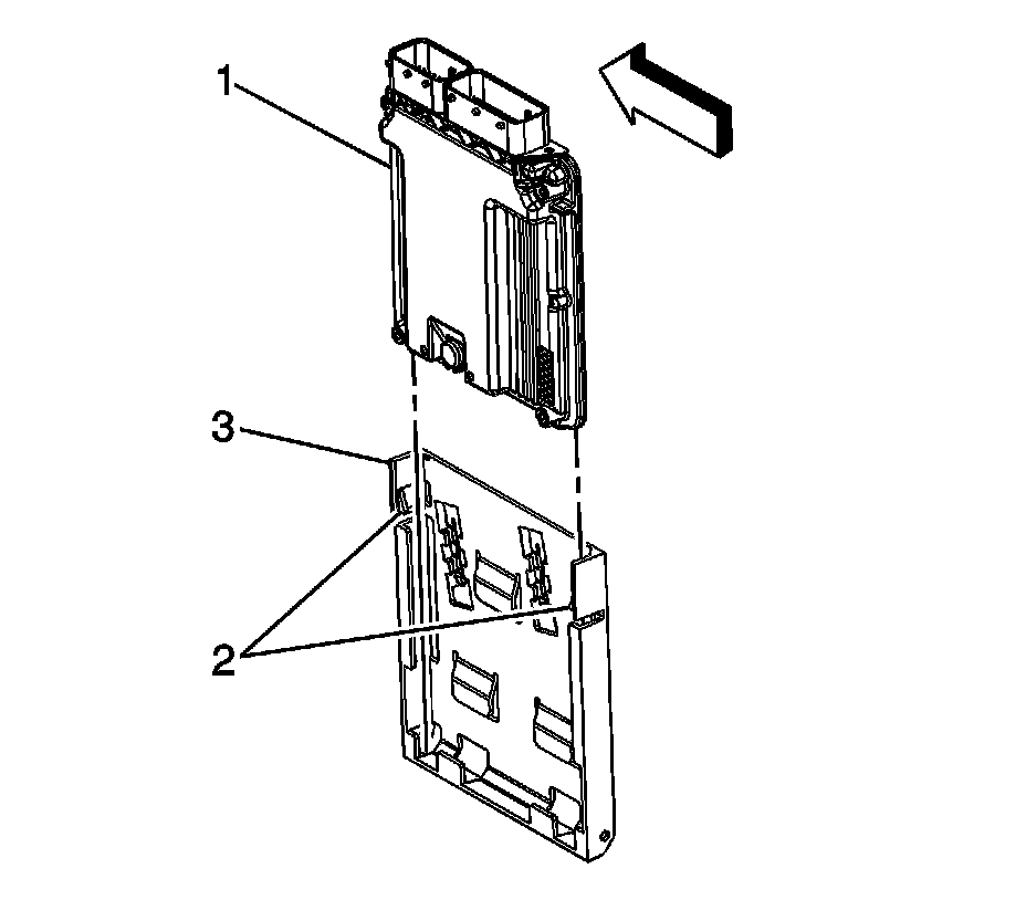 4. Use the tabs (3) in order to disengage the retainers (2) on the ECM bracket from the ECM (1) and remove the ECM.