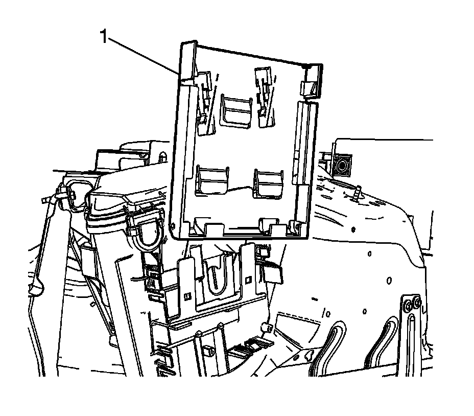 6. Using a small flat-bladed tool, depress the locking tabs (1) on the ECM bracket.