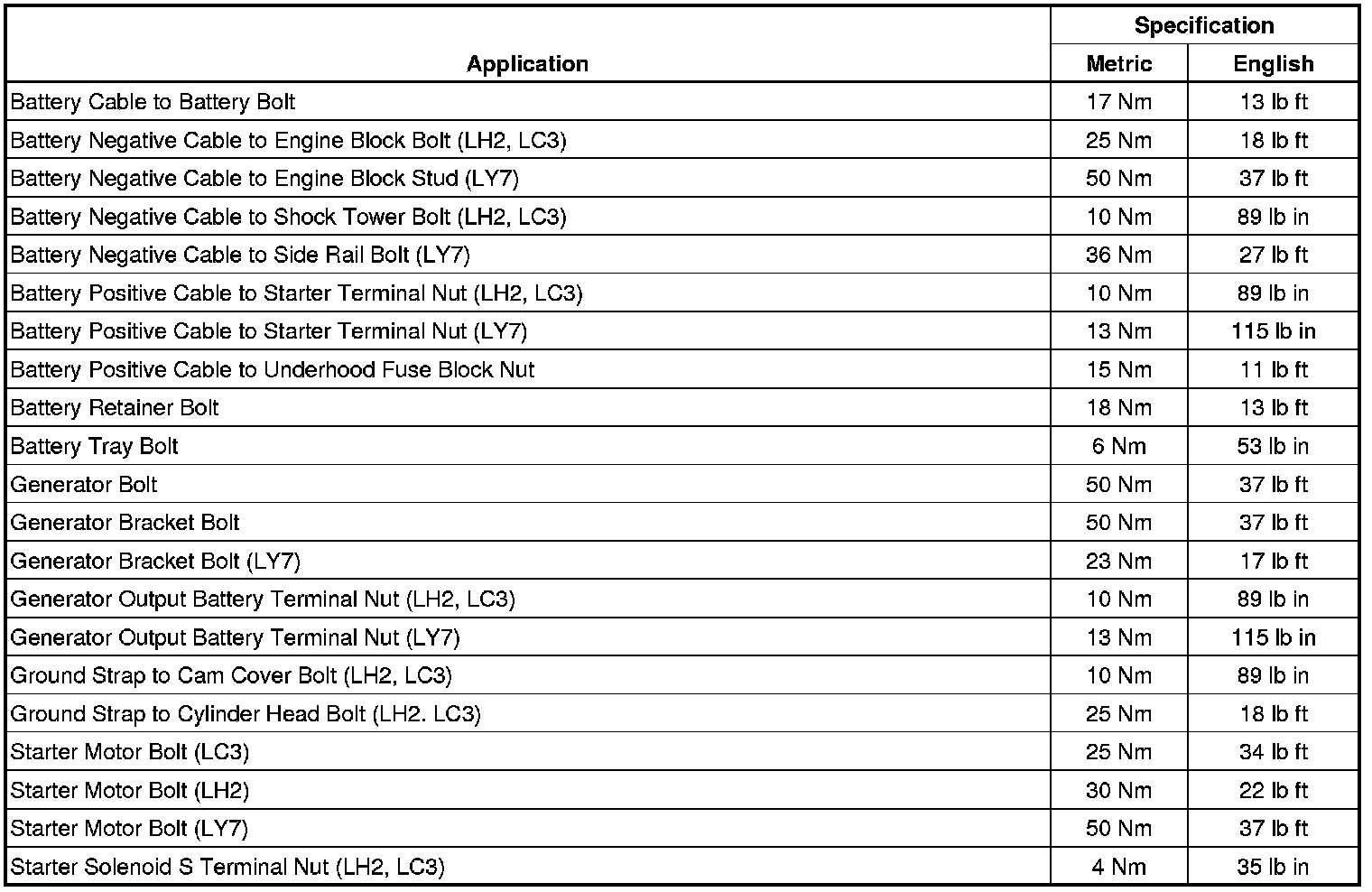 Starting and Charging: Specifications