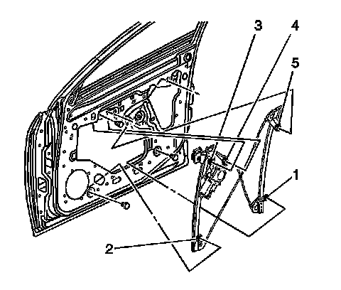 2. Install the window regulator fasteners (1, 2, 3, 4, 5) and tighten to 9 Nm (80 lb in).