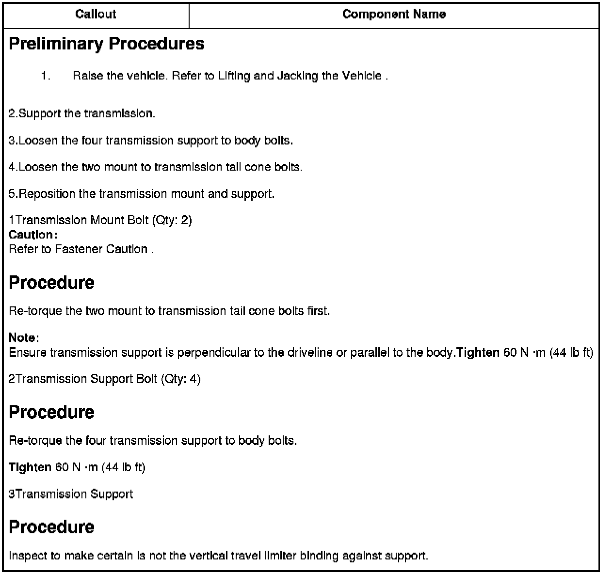 Note:Ensure transmission support is perpendicular to the driveline or parallel to the body.Tighten 60 N �m (44 lb ft)
