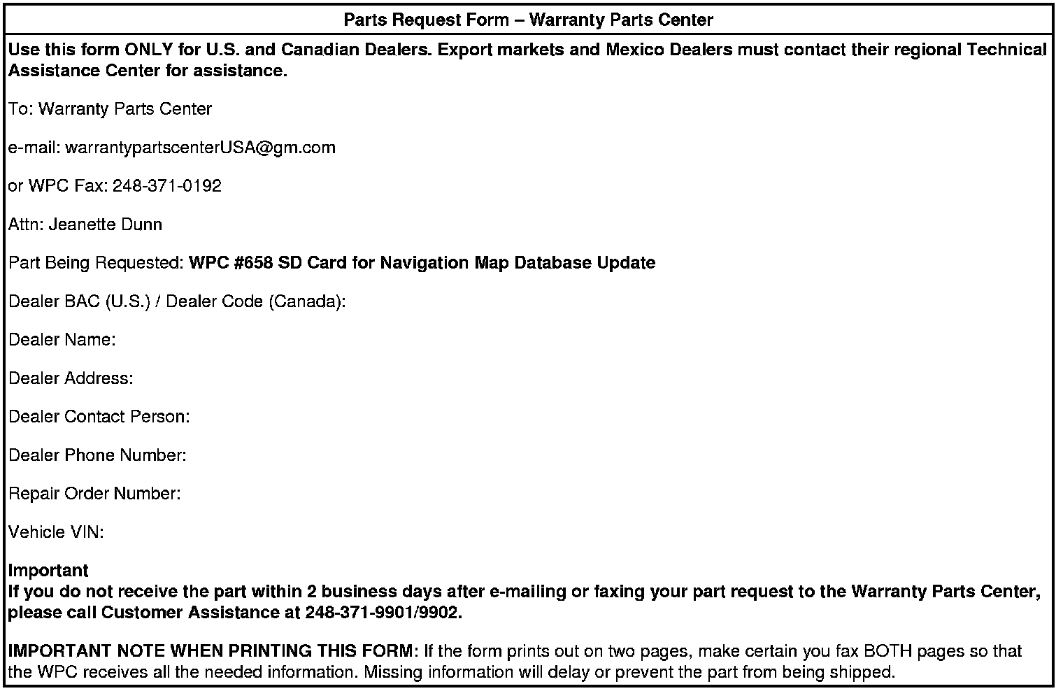 The navigation update SD card, P/N 23113171, which is required to complete this service update, was shipped to Cadillac dealers for use with bulletin # PI0823, which has now been cancelled. All Cadillac dealers should receive this card no later than Friday, October 19, 2012 (in Canada, Tuesday, October 23, 2012). This single card will update all involved vehicles. DO NOT GIVE THE SD CARD TO THE CUSTOMER. Do not order the SD card from GMCC&A or the GM Nav Disc Center. If you have not received your SD card and you have involved vehicles, the SD card can be obtained from the Warranty Parts Center (WPC) using the Parts Request Form found at the end of this bulletin.