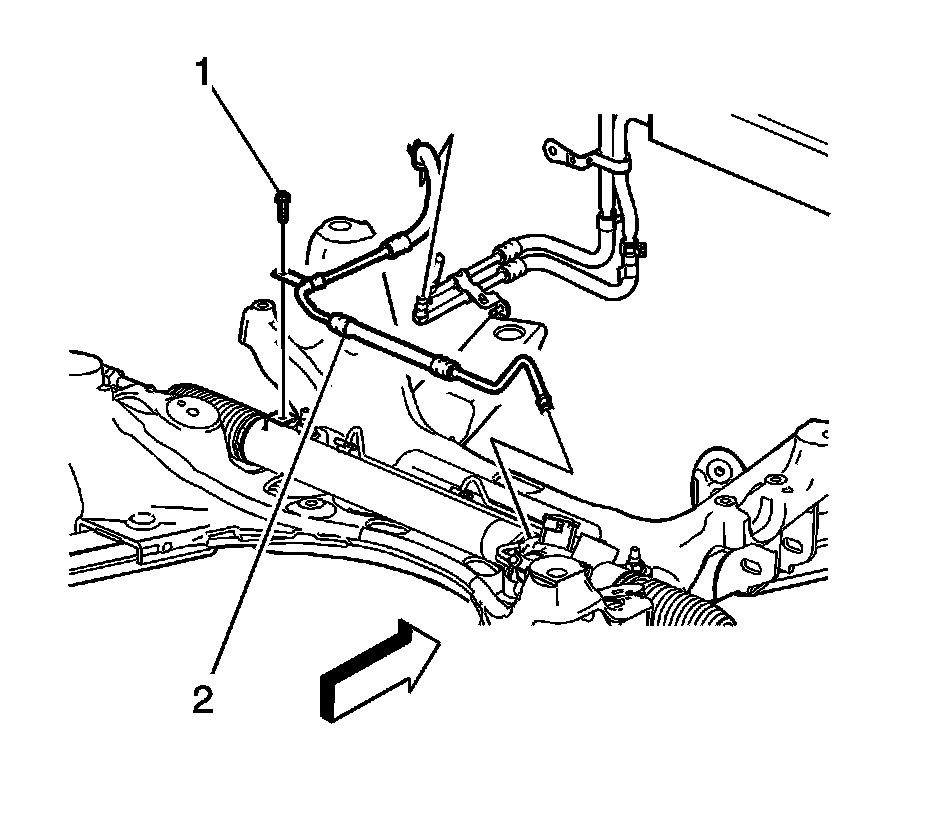 9. Remove the power steering gear outlet hose (2) from the vehicle.