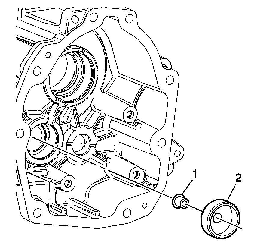 18. Insert a brass drift (1) through the mainshaft opening of the extension housing, into the oil clearance gap. Using a mallet, tap down on the drift to remove the mainshaft bearing race (2).