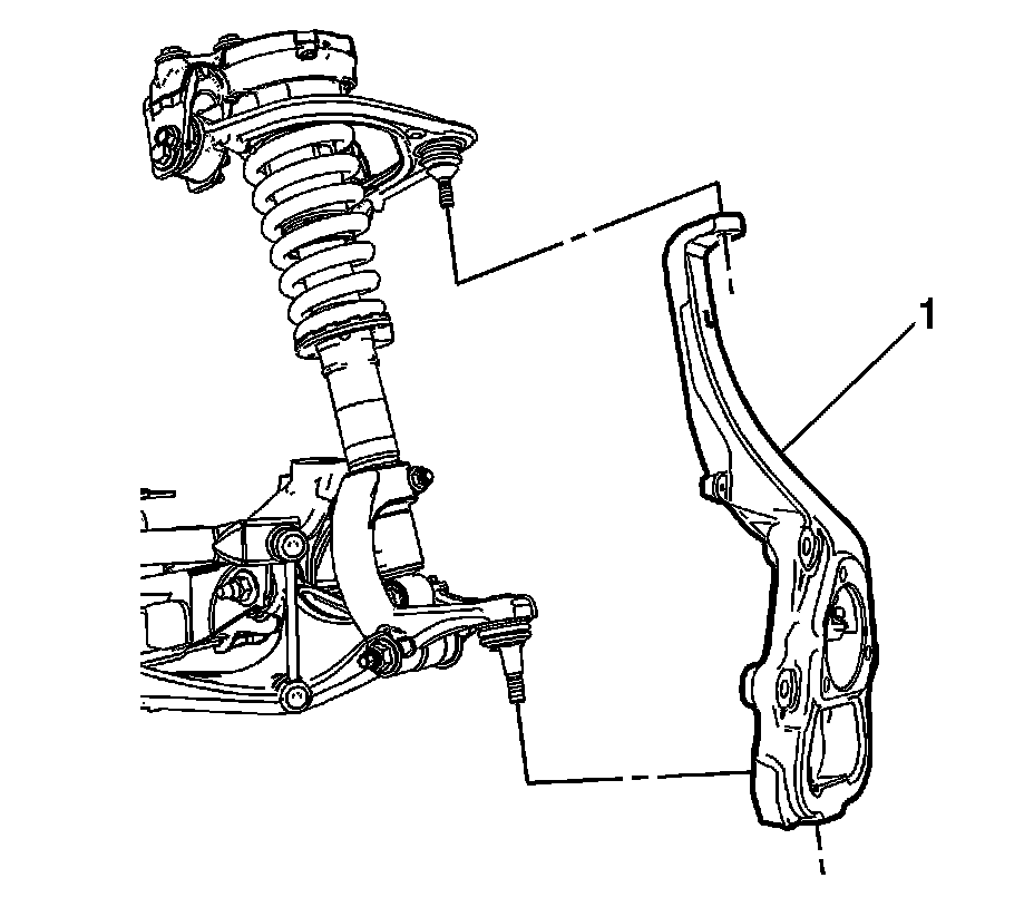 7. Remove the steering knuckle (1) lower from the control arm. Refer to Lower Control Arm Replacement (FWD) Lower Control Arm Replacement (FWD)Lower Control Arm Replacement (AWD) Lower Control Arm Replacement (AWD).