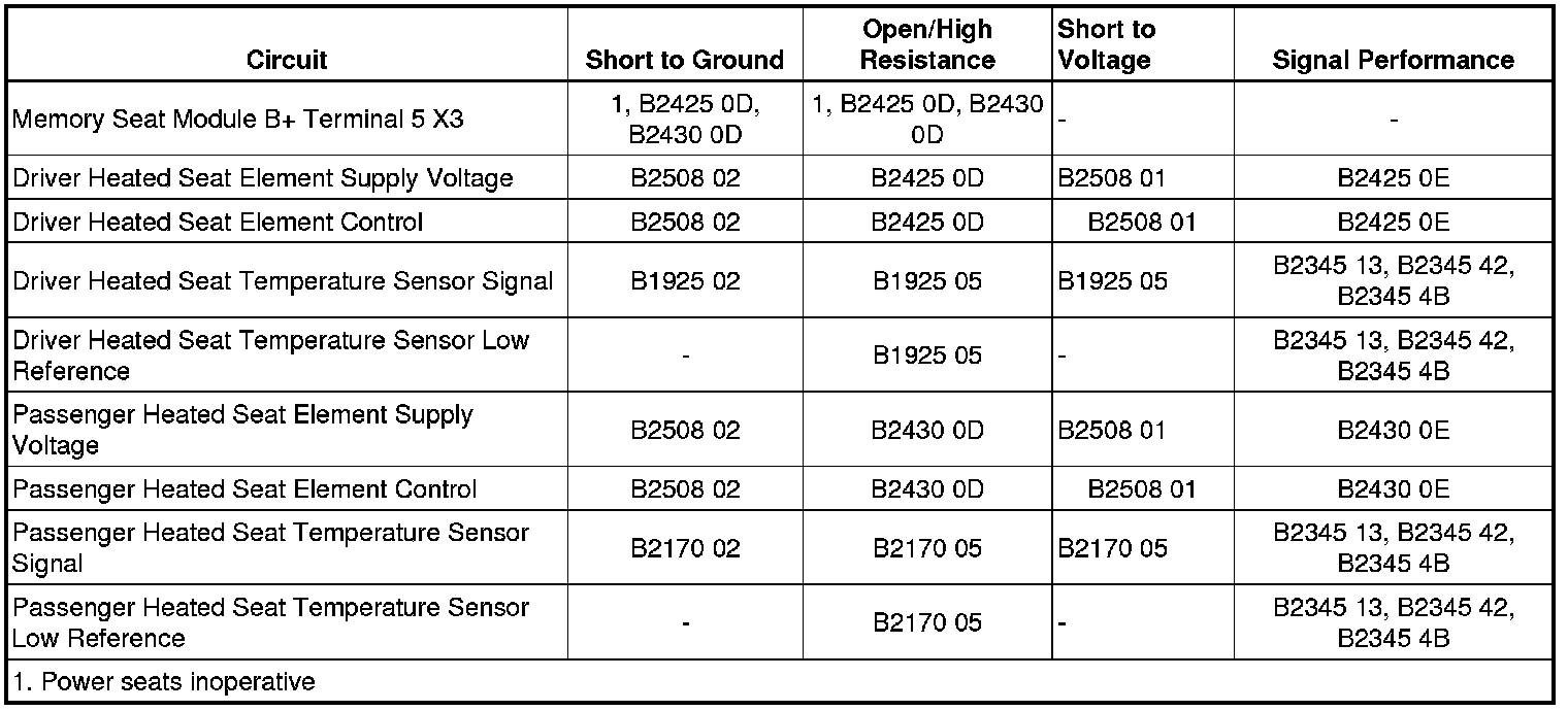 The heated seat heating elements are controlled by a common high current relay internal to the memory seat module (MSM) and by individual low side element control circuits. The MSM connects the heater element supply voltage circuits for both seats to a common reference point. This reference point is biased to approximately 2.5 V. Before the MSM will allow heated seat operation, it checks to see if the heating element supply voltage circuits and control circuits are shorted to ground or voltage. Once the module verifies that it is not closing into a shorted heating element, it allows heated seat operation. After which it continues to monitor for a shorted a circuit.