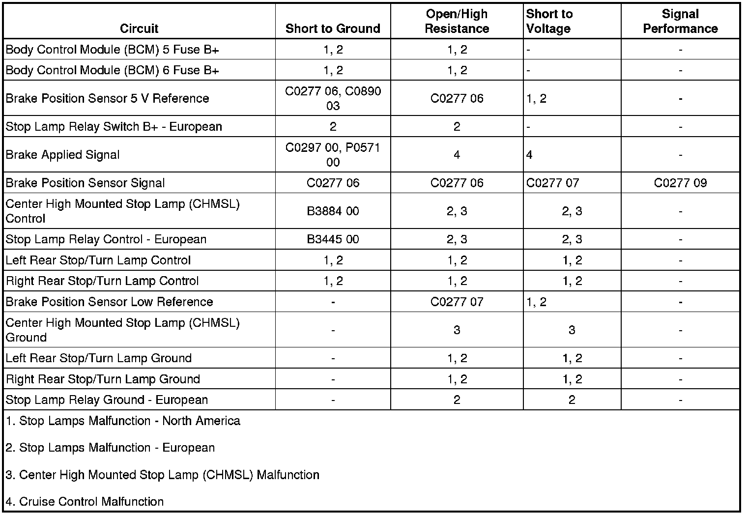 The brake pedal position sensor is used to sense the action of the driver application of the brake pedal. The brake pedal position sensor provides an analog voltage signal that will increase as the brake pedal is applied. The body control module (BCM) provides a low reference signal and a 5 V reference voltage to the brake pedal position sensor. When the variable signal reaches a voltage threshold indicating the brakes have been applied, the BCM will apply battery voltage to the right and left stop lamp control circuits, transmission control module (TCM), engine control module (ECM), and center high mounted stop lamp (CHMSL) control circuit.