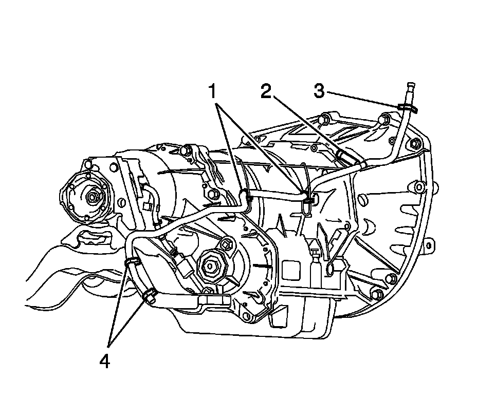 4. Remove the vent hose from the retainers (4) located on the transmission mount assembly.