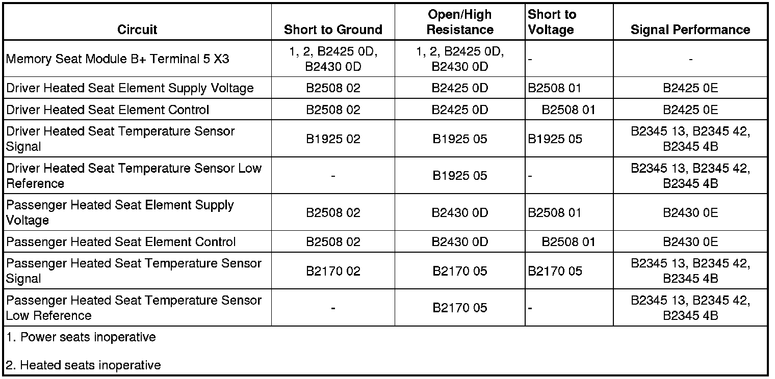 The heated seat temperature sensor that set this diagnostic trouble code (DTC) is located in the seat cushion just under the seat cover with the seat heating element. The memory seat module (MSM) supplies a 5 V reference voltage through the temperature sensor signal circuit and a ground through the low reference circuit to the sensor. The module monitors the voltage of the sensor signal circuit to determine the temperature of the seat. The temperature sensor varies in resistance based on the temperature of the heating element causing the signal voltage to change. Once the seat reaches the set temperature, the module will then cycle the control circuit of the heating elements ON and OFF in order to maintain the desired seat temperature based on the feedback voltage from the sensor.