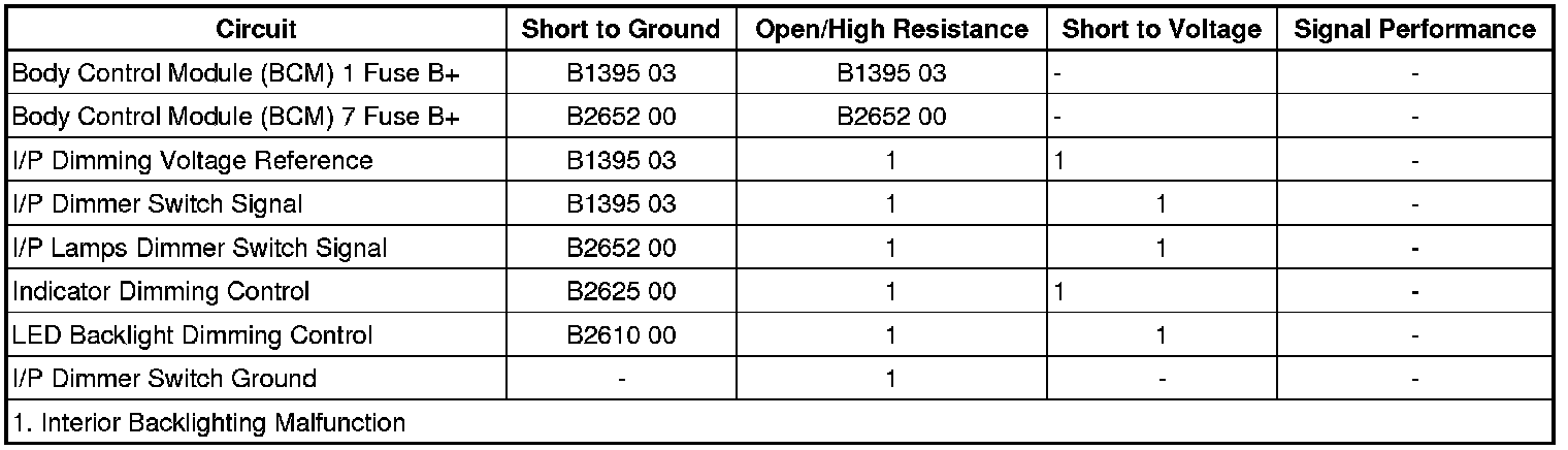The instrument panel (I/P) dimmer switch is used to increase and decrease the brightness of the interior backlighting components. The I/P dimmer switch provides a voltage signal that will increase as the brightness of the lights are increased and decrease as the brightness of the lights are decreased. The body control module (BCM) provides a low reference signal and a B+ voltage reference to the I/P dimmer switch. When the I/P dimmer switch is placed in the desired position, the dimmed voltage setting is applied from the I/P dimmer switch through the I/P dimmer switch signal circuit to the BCM. The BCM interprets the signal and applies the dimmed voltage to the I/P lamps supply voltage circuit and the interior backlighting components dim to the requested level.
