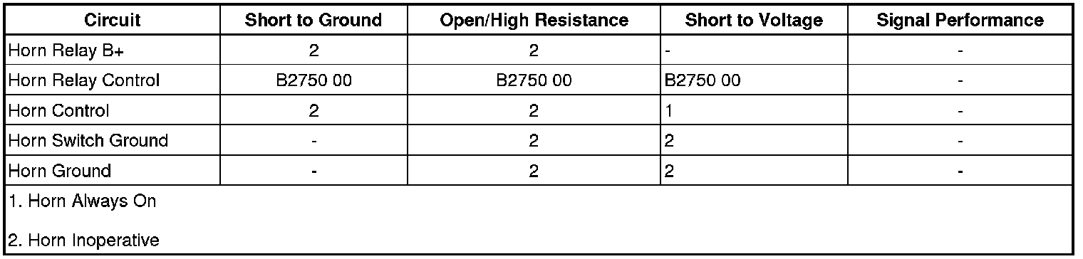 • If the test lamp does not illuminate, test the B+ circuit for an open/high resistance. If the circuit fuse is open, test the control circuit terminal 87 for a short to ground. If all circuits test normal, test or replace the HORN relay.