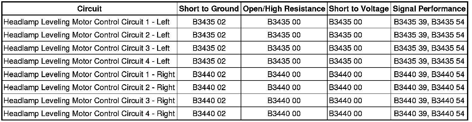 * When DTC B3435 or DTC B3440 sets, the headlamp control module will attempt to return the lamps to a nominal position and disable all requests to all headlamp actuators.