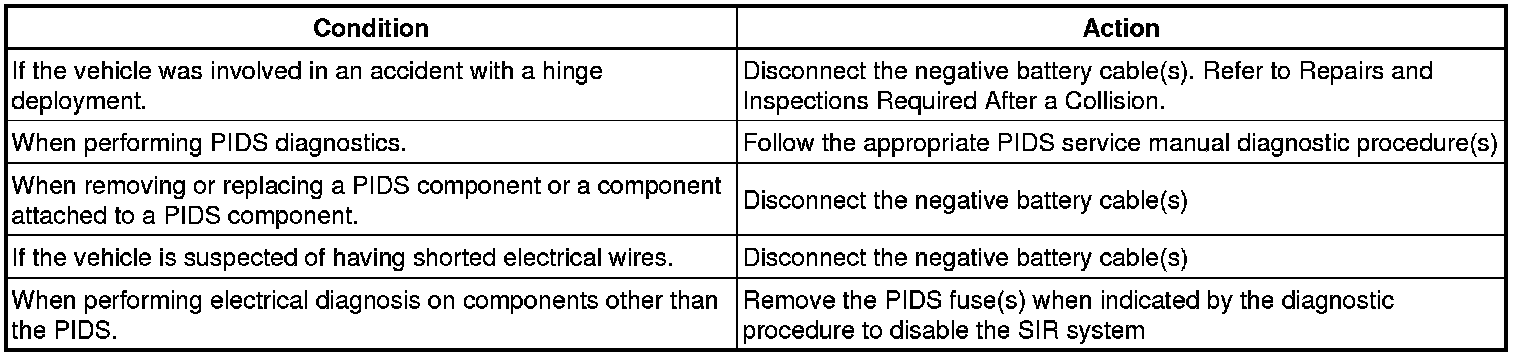 When performing service on or near the pedestrian impact detection system (PIDS) components or the PIDS wiring, the PIDS must be disabled. Failure to observe the correct procedure could cause deployment of the PIDS components. Serious injury can occur. Failure to observe the correct procedure could also result in unnecessary PIDS repairs
