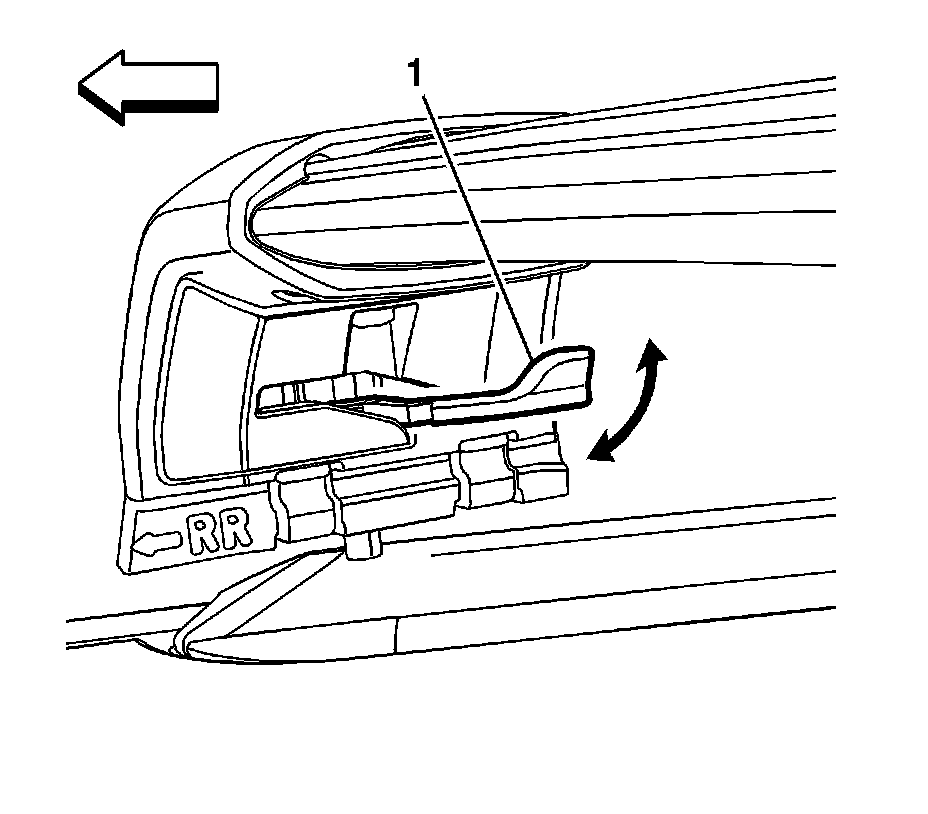 8. Move the levers (1) on both cross rail ends to the down position, towards the rear of the vehicle. Slide the cross rail back and forth until the cross rail pin engages.