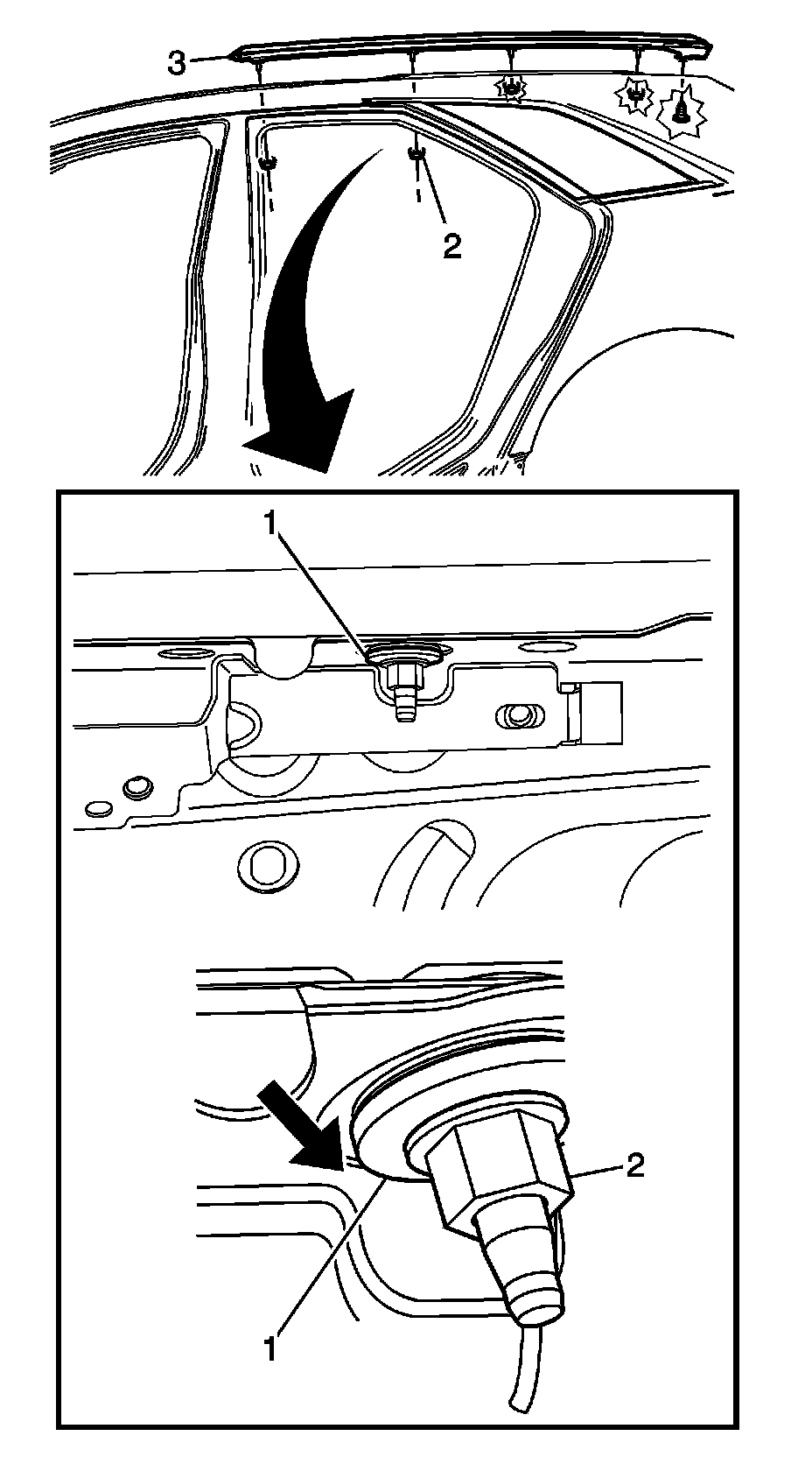 If the nut (1) separated from the washer (2) during removal, it cannot be reinstalled. A new nut would be required. If the nut is separated and not replaced it may create a creak in the roof area.