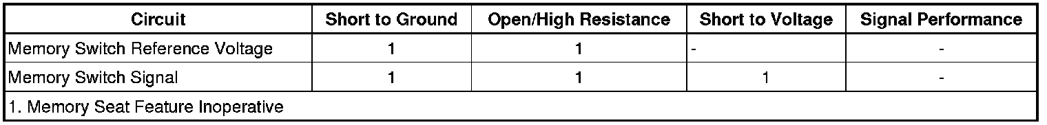 Reference voltage is supplied to the memory switch from the driver door module (DDM). When a memory switch is pressed, battery voltage is applied through the switch contacts, a series of resistors and thorough the memory switch signal circuit to the DDM. The door module then sends a serial data message to the memory seat module (MSM) indicating the memory recall request. The MSM then commands the appropriate seat motors to move to the pre-recorded seat positions stored in memory in response to the switch input.