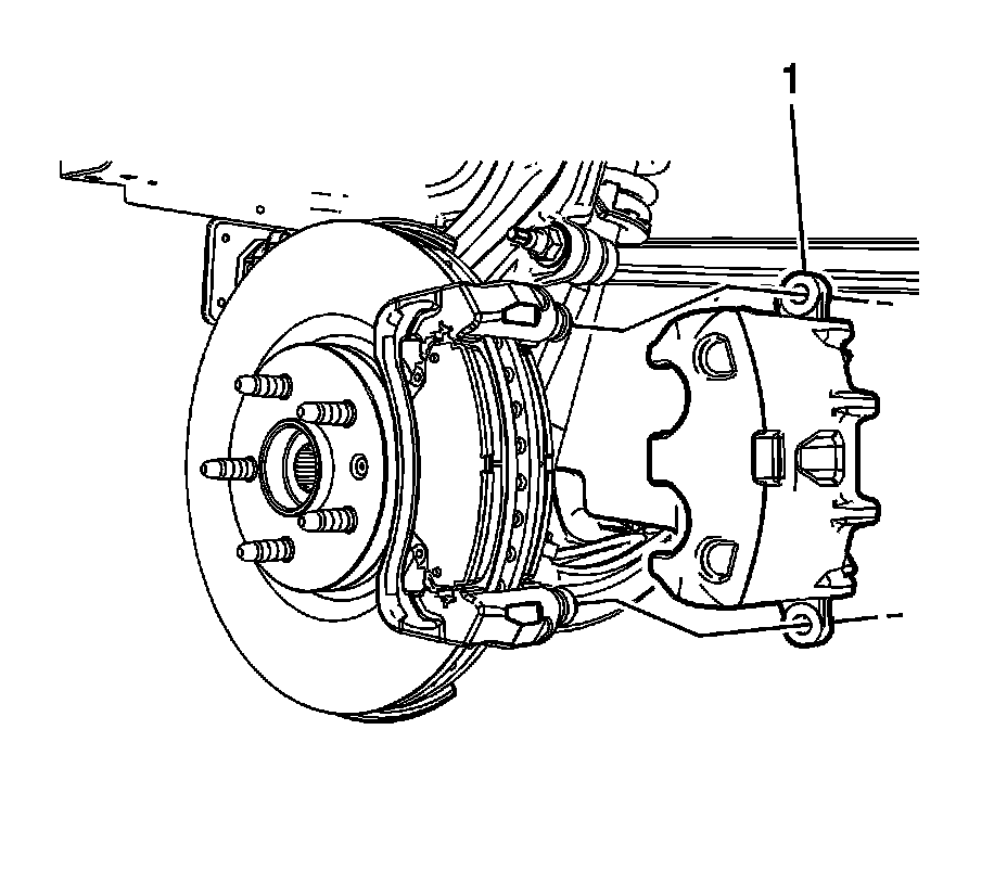 8. Using a backup wrench on the brake caliper guide pin, remove the brake caliper guide pin bolts (1).