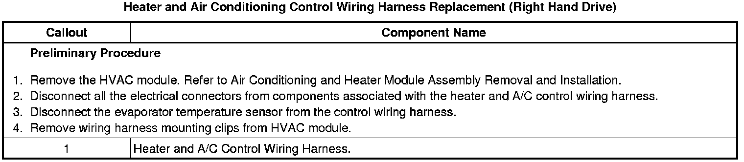 Heater and Air Conditioning Control Wiring Harness Replacement (Right Hand Drive)