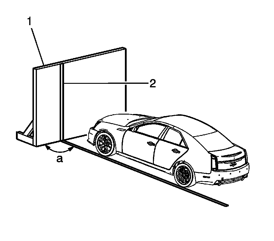 6. The vehicle left tires must be aligned with the reference line extending from the screen with the headlamps aligned with the vertical reference line (2).