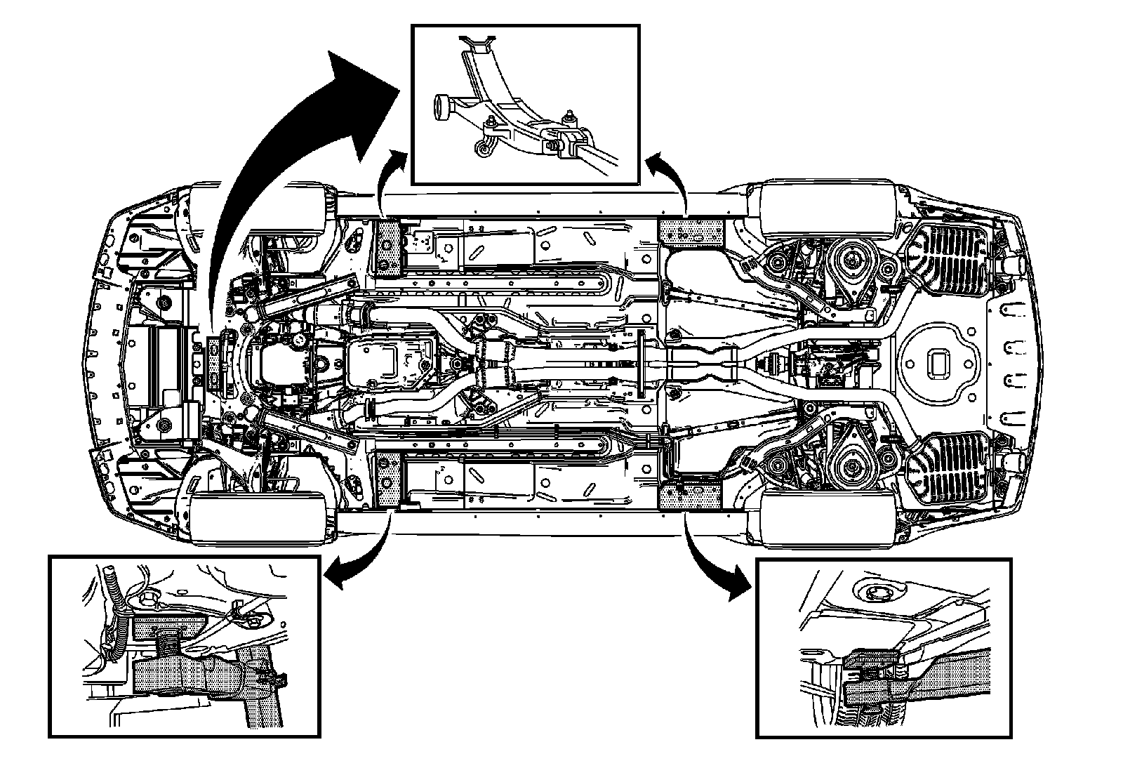 When you are jacking the vehicle at the front locations, be certain that the jack or the jack lift pad does not contact the front fascia, front fascia air dam, or the front fenders. If such contact occurs, vehicle damage may result. When jacking at selected front locations additional clearance may be required for the jacking points.