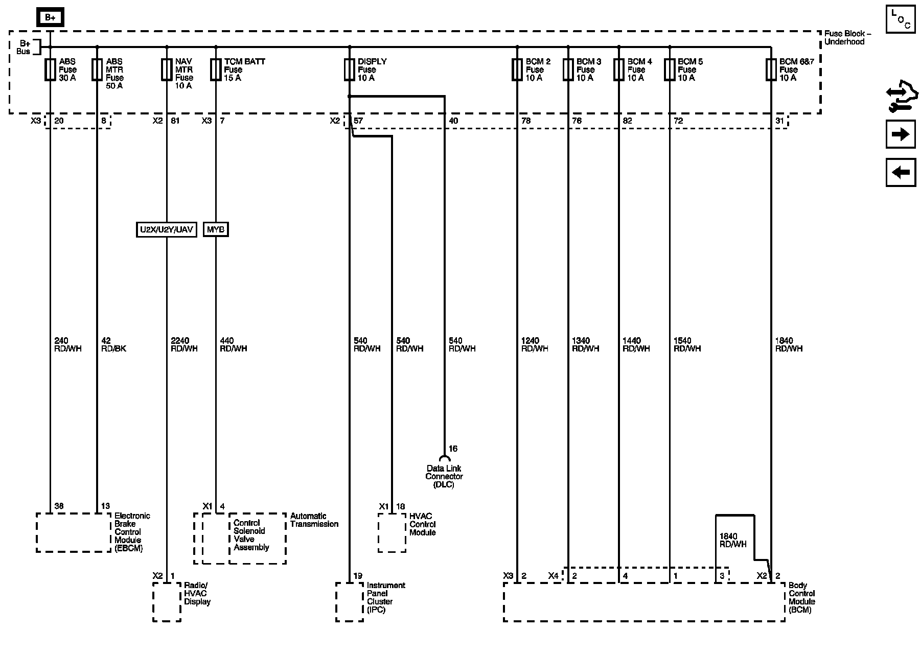ABS, ABS MTR, BCM 2, BCM 3, BCM 4, BCM 5, BCM 6, BCM 7, DISPLAY, NAV MTR, and TCM BATT Fuses