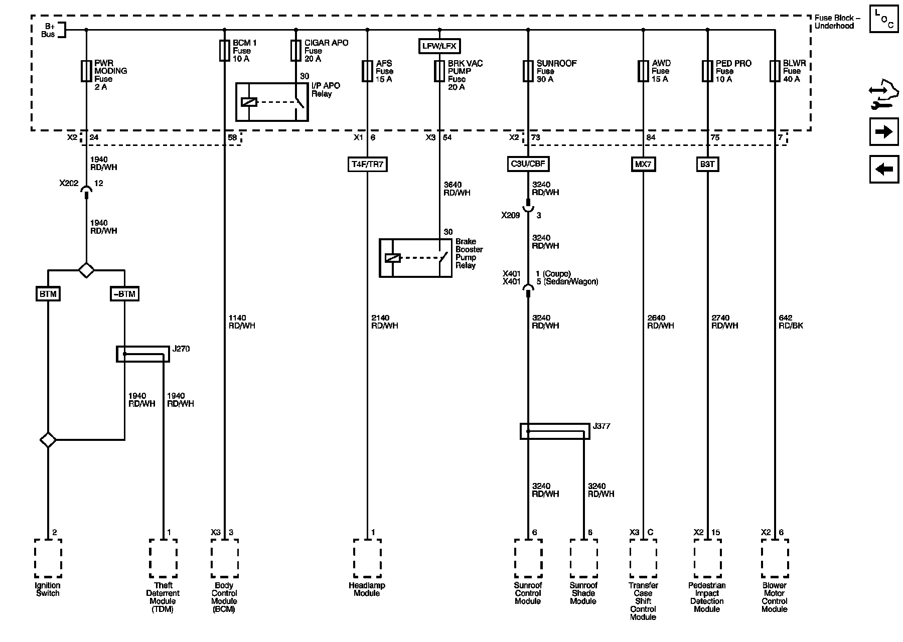 AFS, AWD, BCM 1, BLWR, BRK VAC PUMP, CIGAR APO, PED PRO, PWR MODING, and SUNROOF Fuses
