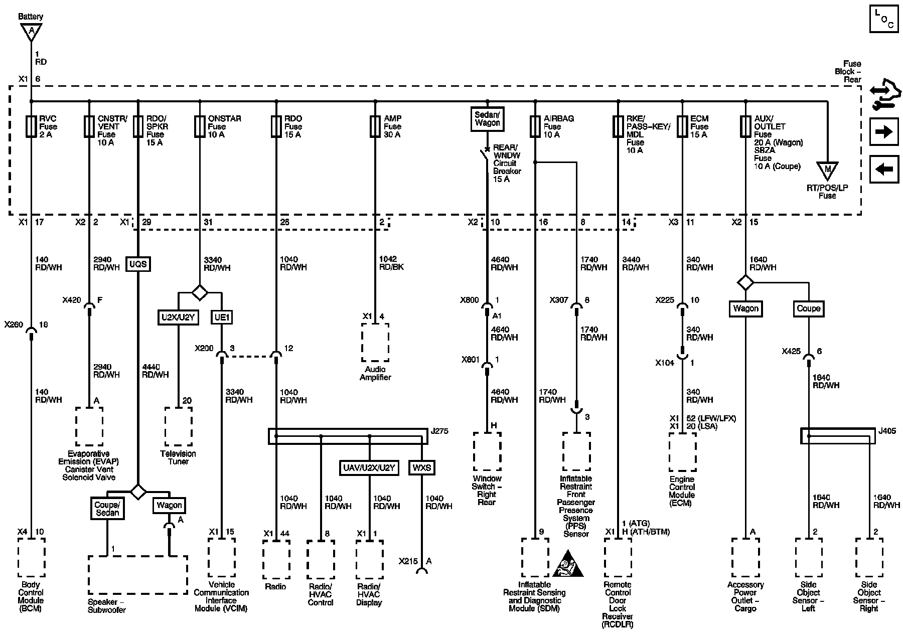 AIRBAG, AMP, AUX OUTLET, CNSTR/VENT, ECM, ONSTAR, RDO, RDO/SPKR, RKE/PASS-KEY/MDL, RVC, and SBZA Fuses, and REAR/WNDW Circuit Breaker